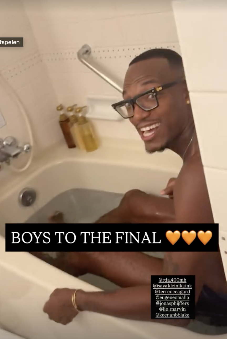 De mannen besloten hun finaleplaats op bijzondere wijze te vieren en doken in bad. Klaver filmde Bonevacia terwijl hij juichend in zijn hotelkamer in bad zat. Ondertussen kwamen ook Isaya Klein Ikkink, haar vriend Terrence Agard en andere ploeggenoten in hun onderbroek aangelopen om de winst te vieren, terwijl Klaver het tafereel juichend filmde.