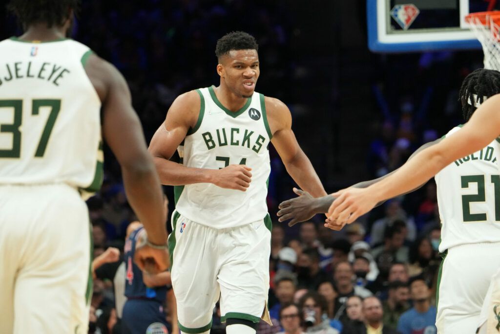 Giannis Antetokounmpo heeft zijn ploeg Milwaukee Bucks langs de Philadelphia 76ers geleid. De kampioenen uit de NBA wonnen in Philadelphia met 118-109.