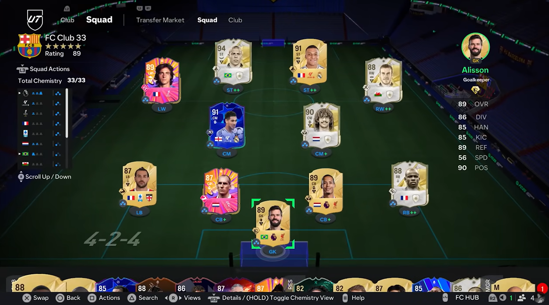 Verstappen heeft vijftien miljoen (een enorme berg in FC-termen) op de bank staan én daarnaast ook nog een uitstekend elftal, met een flink Nederlands tintje. Zo staat Virgil van Dijk achterin met 'hero' Jaap Stam en staat ook 'icon' Ruud Gullit nog op het middenveld. Verder speelt Verstappen met namen als Jude Bellingham en de 'icon'-kaarten van Gareth Bale en de Braziliaanse Ronaldo. Laatstgenoemde is momenteel zo'n 12 miljoen waard op het spel en is daarmee de allerduurste speler.