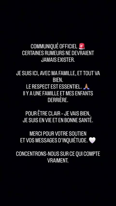 "Er zijn geruchten die er niet zouden moeten zijn. Ik ben in orde, bij mijn familie. Respect is belangrijk, want ik heb een familie en kinderen achter mij. Ik ben in orde, levend en gezond. Ik waardeer jullie berichten van steun en bezorgdheid en laten we ons richten op wat er echt toe doet", schreef de 46-jarige Fransman, die hiermee een einde maakte aan de speculaties.