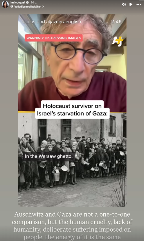 Piquet plaatst de video in haar story en citeert de uitspraken van de man: "Auschwitz en Gaza zijn niet één op één te vergelijken, maar de wreedheid, het gebrek aan menselijkheid en het opzettelijke leed dat wordt veroorzaakt, heeft dezelfde energie."