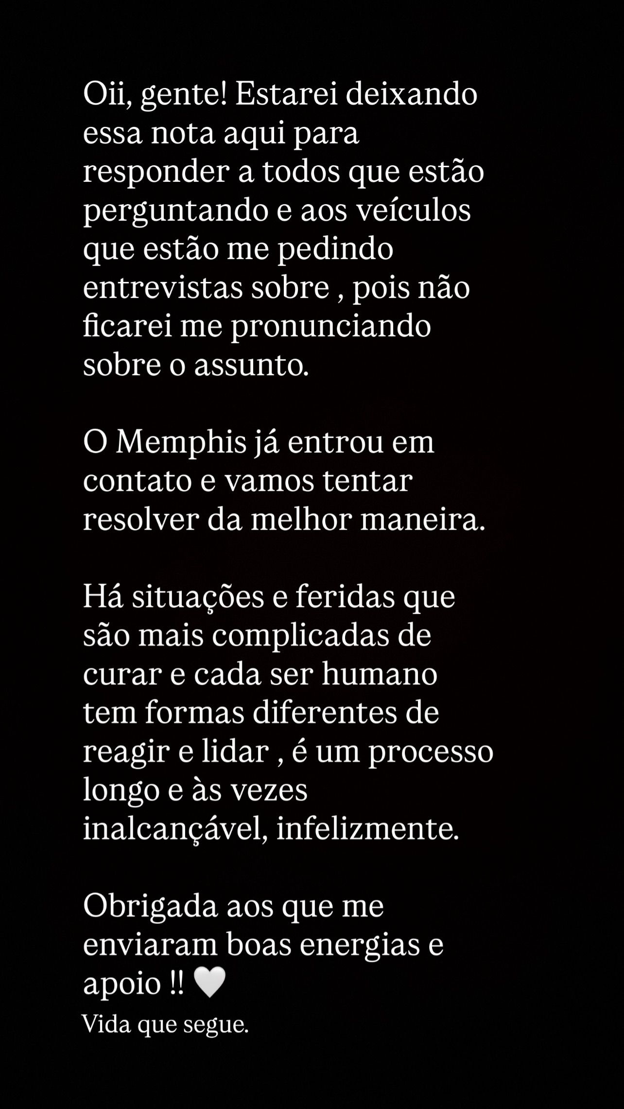 Het gaat om influencer en lifestylejournalist Lary Simões, die vorige maand ontdekte zwanger te zijn. Toen zij Memphis confronteerde met het nieuws, zou hij slecht hebben gereageerd en afstand hebben genomen. Om haar woorden kracht bij te zetten plaatste ze foto's op Instagram van haarzelf en Memphis samen in een woning, van een positieve zwangerschapstest en een gesigneerd Corinthians-shirt voor haar neefje.