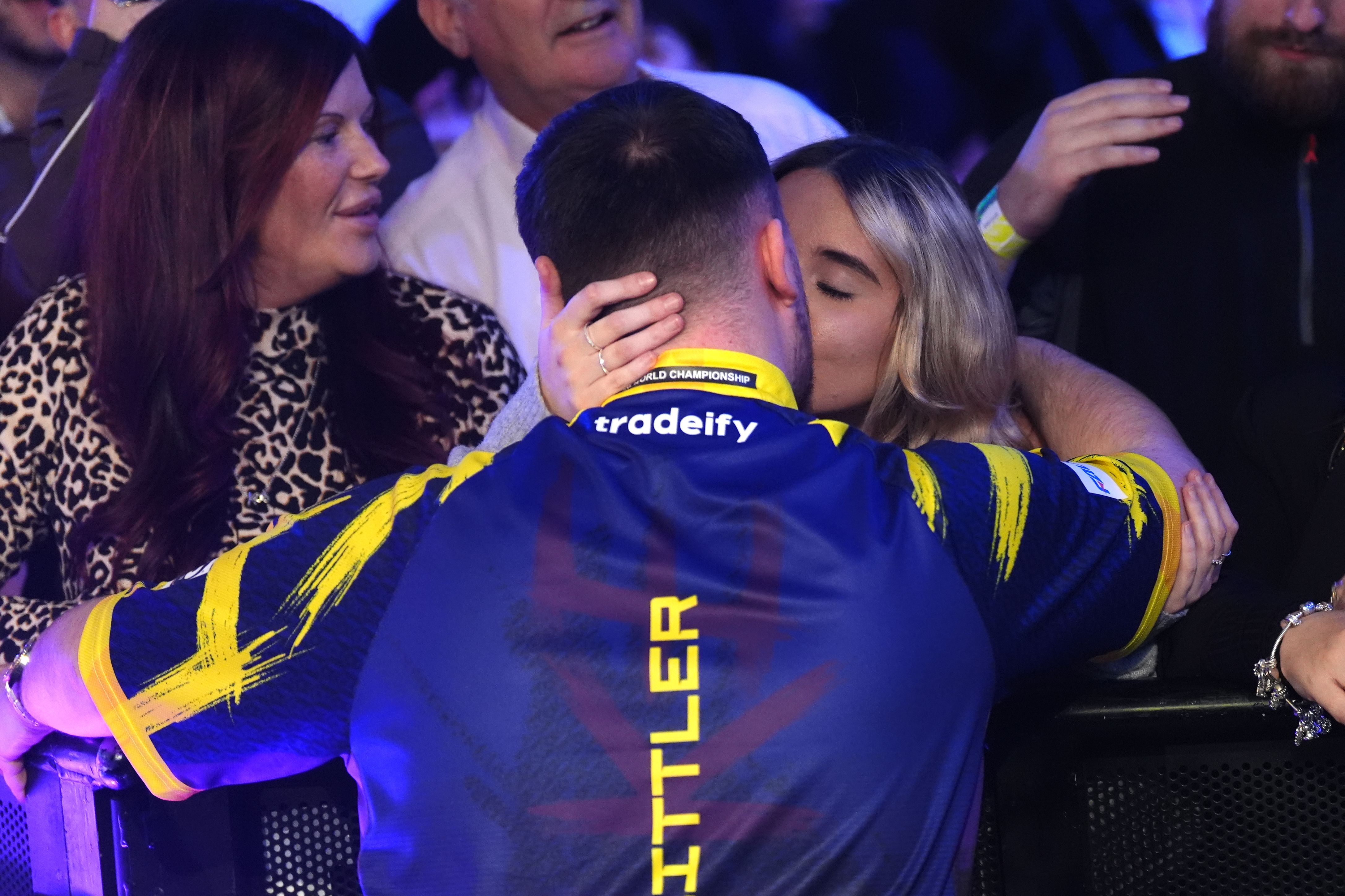 Luke Littler kust zijn vriendin Faith Millar bij zijn opkomst op het WK darts. ©Getty Images