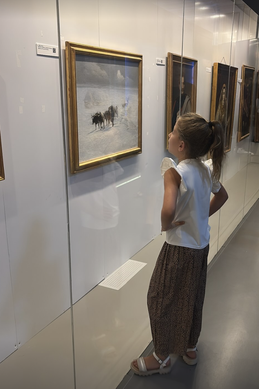 De 8-jarige Jesslynn lijkt diep onder de indruk van het schilderij, zo is te zien op een foto die Polman in haar Instagram-verhaal deelt. Haar dochter bewondert het werk van dichtbij, staand achter het glas. Op het schilderij zijn, zo lijkt het, een aantal koeien in een landschap afgebeeld.