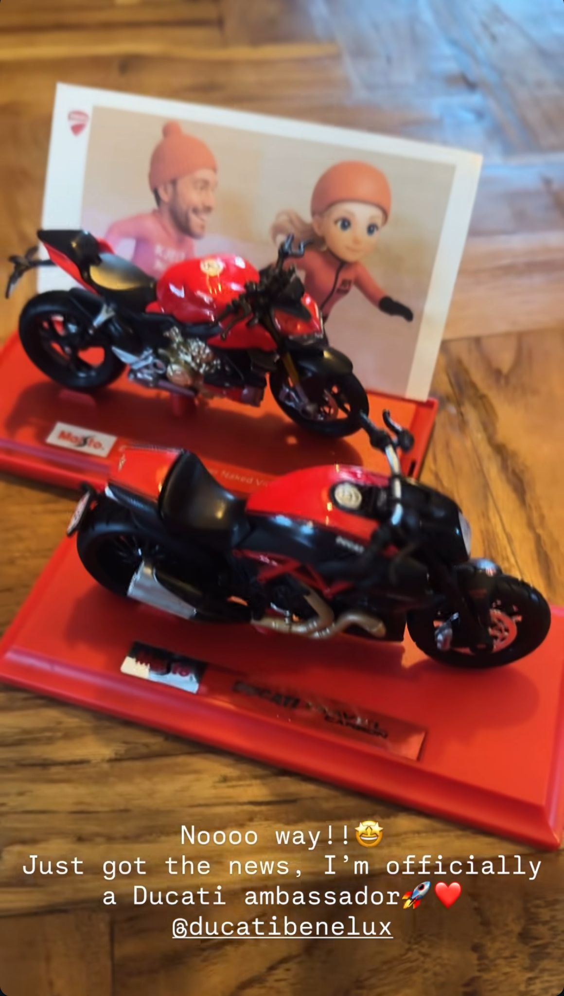 Beune deelde dinsdag in een verhaal op haar Instagram dat ze vanaf nu ambassadeur is voor het prestigieuse motormerk Ducati. "Noooo way!", schrijft ze bij een foto van twee minimotoren en een kaart met een AI-gegenereerd plaatje van haarzelf met Nuis. Beune werd verrast door het nieuws, want ze schrijft er ook bij: "Heb net pas het nieuws vernomen dat ik officieel ambassadeur ben voor Ducati."