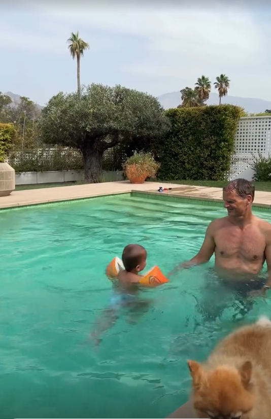 De vakantie lijkt nog altijd in volle gang. Dat blijkt wel uit een nieuwe video die Beau maandag deelde in haar verhaal op Instagram. In de video is vader Frank in een zwembad te zien. Zoontje Saint springt ook in het water, maar of opa De Boer daar zo blij mee is, is maar de vraag. Door de sprong van Saint krijgt de voetballegende namelijk een aantal grote spetters water in zijn oog, waarna hij wat moeilijk kijkt.