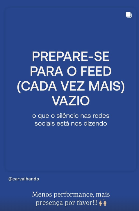 De vriendin van Verstappen deelt dinsdag een bericht van de Braziliaanse schrijver André Carvalhal waarin een gevoel wordt besproken waar Piquet zich goed in kan vinden. Hij merkt op dat volgens experts het moment is gekomen waarop sociale media steeds minder gebruikt worden door mensen om zelf dingen te plaatsen "Bereid je voor op een lege feed", valt er in de eerste foto te lezen.