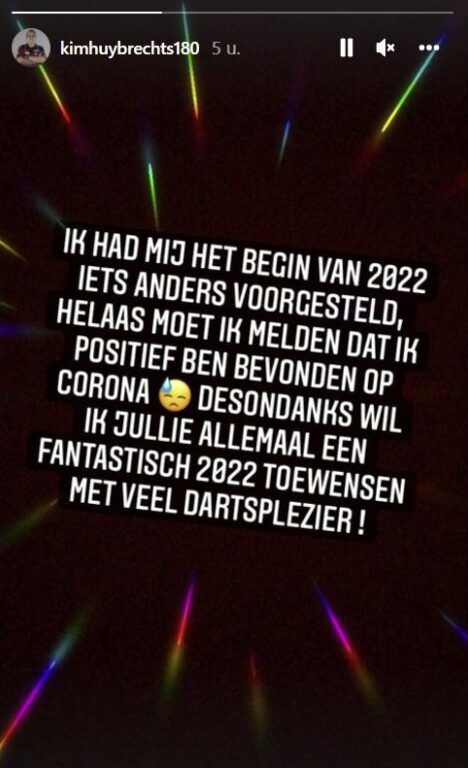 Huybrechts, die zijn besmetting op nieuwjaarsdag via Instagram bekendmaakte, verloor in de 3e ronde van Gerwyn Price. De regerend wereldkampioen uit Schotland boekte een 4-3-overwinning. Daarvoor had Huybrechts dankzij een 3-1 overwinning op Steve Beaton de 3e ronde van het wereldkampioenschap in Londen bereikt.