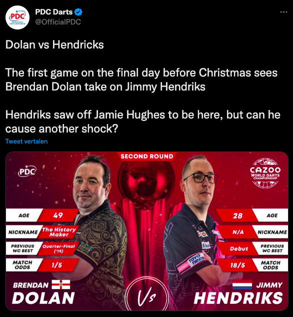 Jimmy Hendriks, Jerry Hendriks. De PDC heeft het er maar moeilijk mee wie er nou meedoet aan het WK darts. Inmiddels zijn ze er wel achter dat het om Jimmy gaat, maar alsnog stoeien ze met zijn achternaam. Voorafgaand aan het duel in de 2e ronde met Brendan Dolan ging het opnieuw mis rond Jimmy Hendriks.