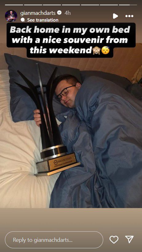 Na zijn zege besloot Van Veen om niet te blijven hangen in Dortmund. De Nederlander stapte na de finale in de auto naar huis om weer in zijn eigen bed te kunnen slapen. Eenmaal in de slaapkamer aangekomen deelde hij een heerlijke story. 'Weer thuis in mijn eigen bed met een mooi souvenir van dit weekend', zet Van Veen bij een foto van zichzelf met de EK-beker in bed.
