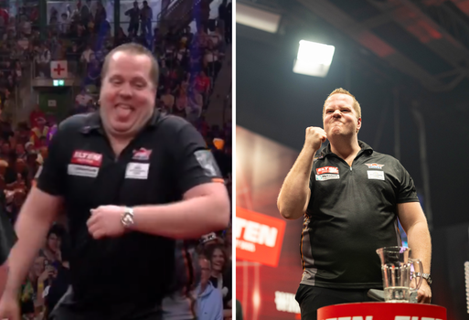 Het moment dat Luke Humphries op bijzondere wijze een slokje van zijn water neemt. ©Viaplay