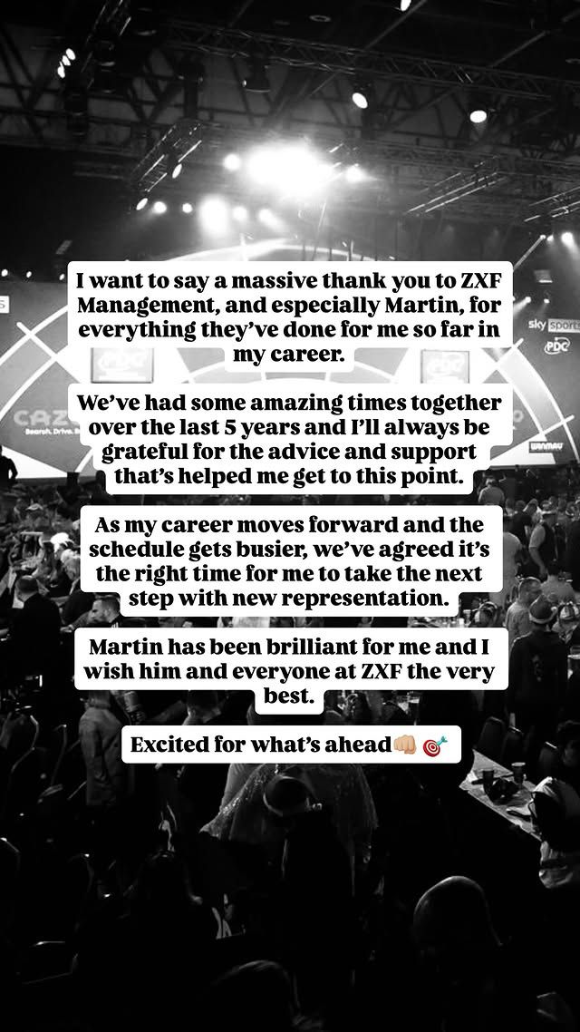 Zo maakt Littler bekend dat hij gaat veranderen van management. De wereldkampioen schrijft: ''Ik wil ZXF Managment enorm bedanken, en in het speciaal Martin, voor alles wat ze tot nu toe hebben gedaan voor mijn carrière.''