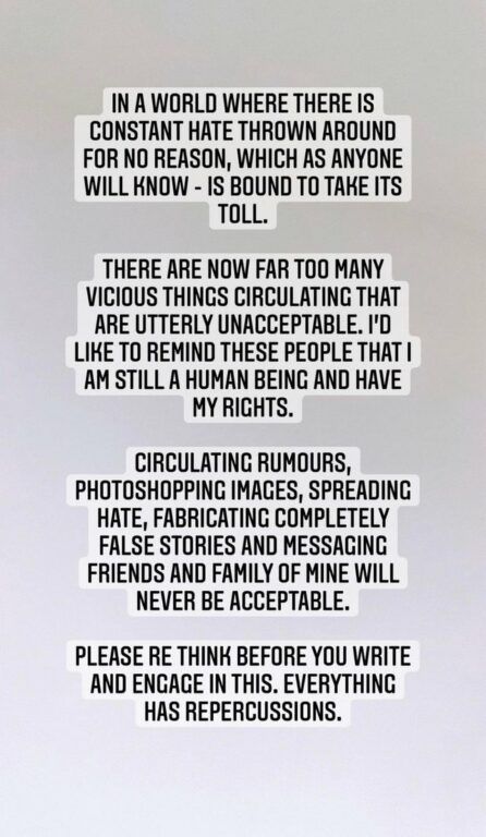 "Valse geruchten verspreiden, foto’s aanpassen, haat sturen, verhalen compleet verzinnen en mijn familie en vrienden lastig vallen zijn dingen die nooit oké zullen zijn. Denk alsjeblieft na voor je iets zegt of doet. Alles heeft gevolgen."