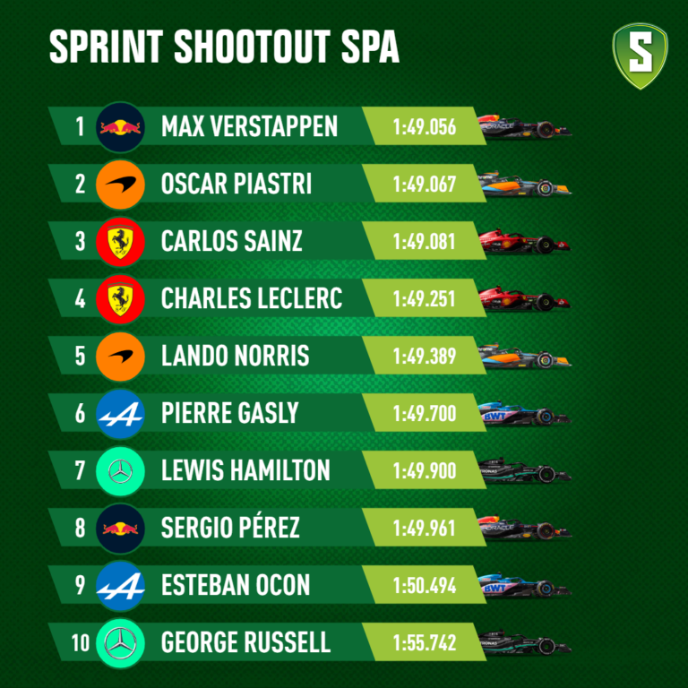 De sprint shootout op Spa levert P1 op voor Max Verstappen. De kwalificatie voor de sprintace ging later van start dan gepland, vanwege de regen boven het circuit. Oscar Piastri werd 2e, Carlos Sainz 3e.
