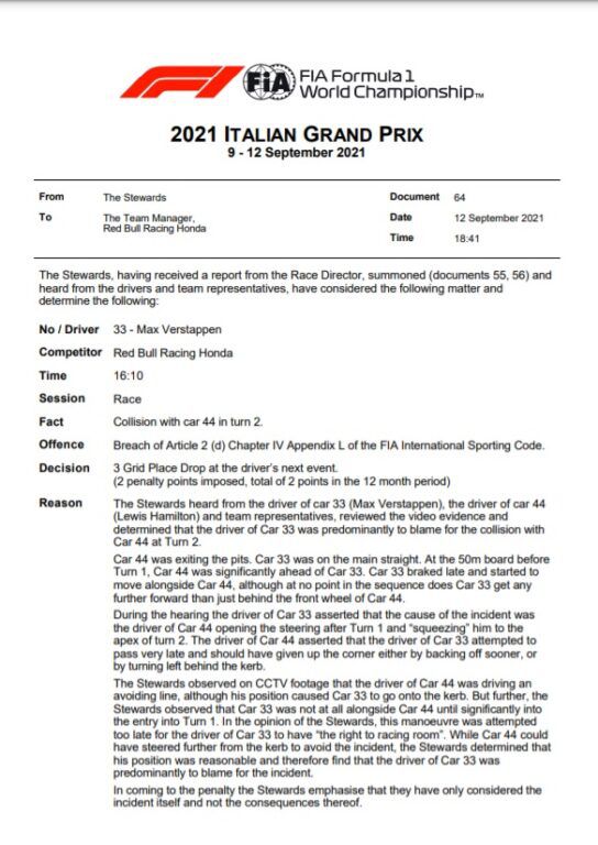 "Verstappen vindt dat Hamilton hem afsneed ('squeezing')", zo gaat het rapport verder. "Hamilton vindt dat Verstappen erg laat wilde passeren. De stewards vinden dat Hamilton wel veroorzaakte dat Verstappen op de kerbs ging rijden. Maar ook vinden de stewards dat Verstappen te laat zijn inhaalpoging inzette. Daardoor had Verstappen niet 'het recht' om er voorbij te mogen racen ('the right to racing room')."