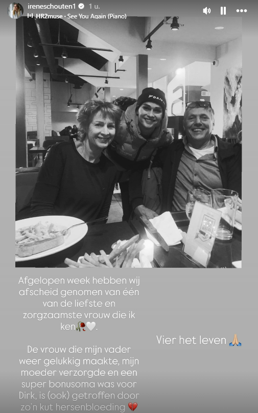 Dat noodlot trof ook Maria eind november, zo schrijft Schouten op Instagram. "De vrouw die mijn vader weer gelukkig maakte, mijn moeder verzorgde en een super bonusoma was voor Dirk, is (ook) getroffen door zo'n kut hersenbloeding." Ze overleed vorige week op 64-jarige leeftijd.