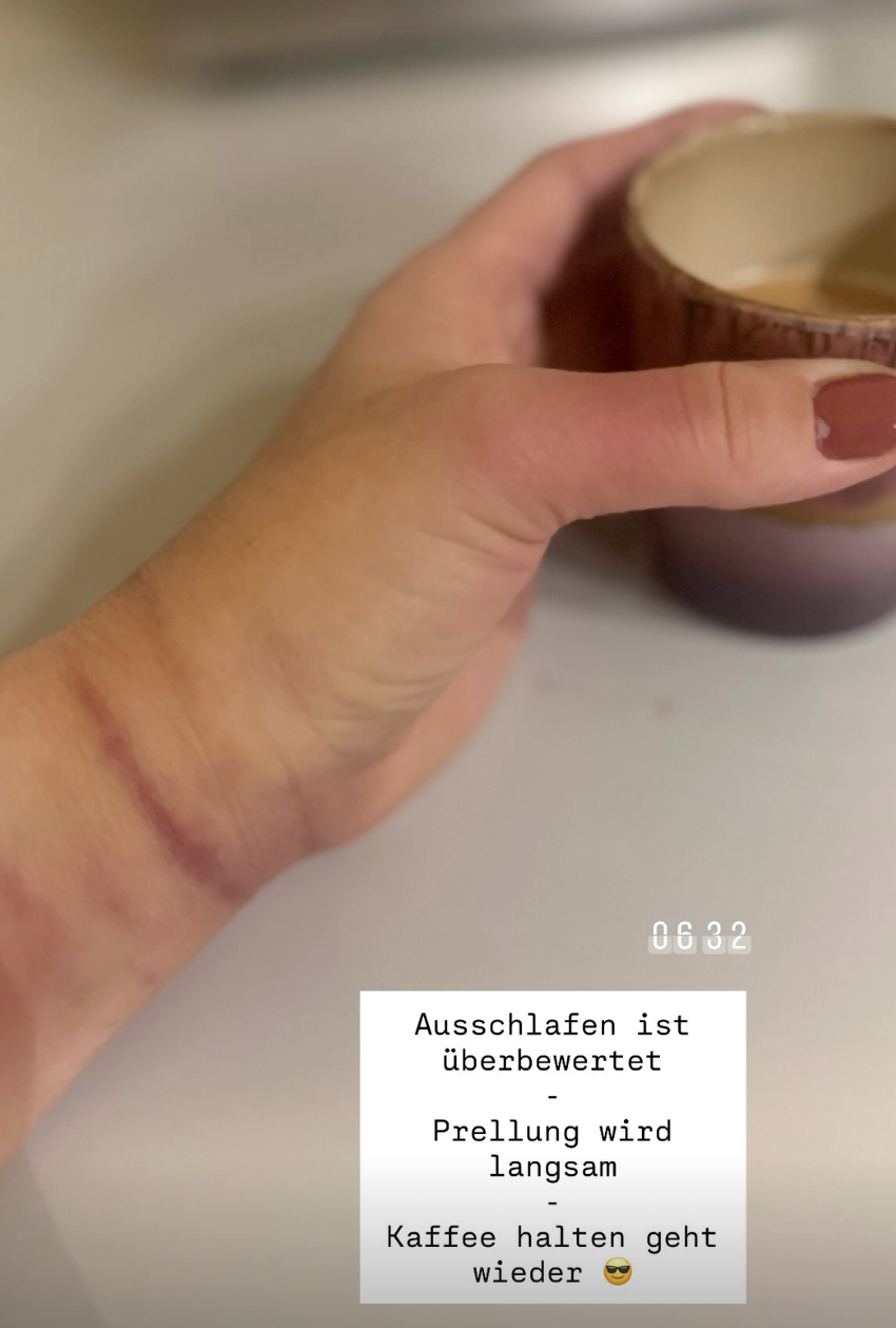 En dat het weer wat beter gaat met haar pols is fijn, want nu kan ze eindelijk weer normaal een lekker bakkie drinken, iets wat ze graag doet. 'Koffie vasthouden lukt weer', zo voegde ze aan haar update toe.