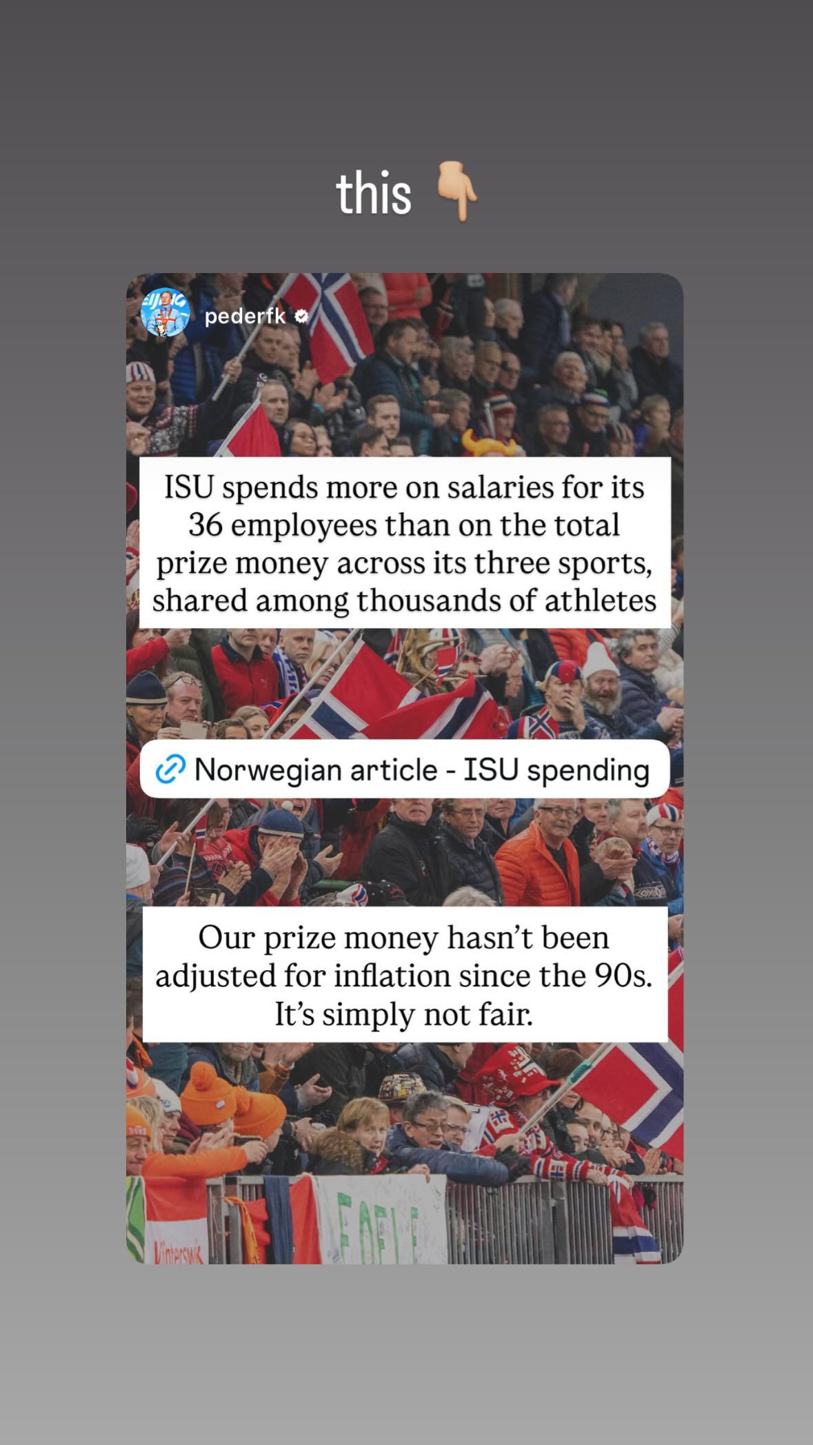 De woorden van Kongshaug en Wiklund bleven niet onopgemerkt in Nederland. Merijn Scheperkamp, sprintspecialist van Team Essent, pikte de kritiek op en deelde het verhaal in zijn Instagram-story. Daarmee liet hij zien dat ook onder Nederlandse schaatsers frustratie leeft over de manier waarop de ISU met prijzengeld omgaat.
