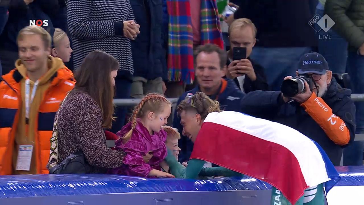 De rijder van Team Albert Heijn-Zaanlander reed vervolgens onder luid gejuich van de fans op de tribunes nog een rondje over het ijs in Thialf, maar stopte toen hij een paar bekende mensen langs de kant zag. Aan de rand van de baan stonden namelijk zijn vrouw Heather Richardson-Bergsma, die zelf vroeger ook topschaatsster was, en hun twee kinderen.