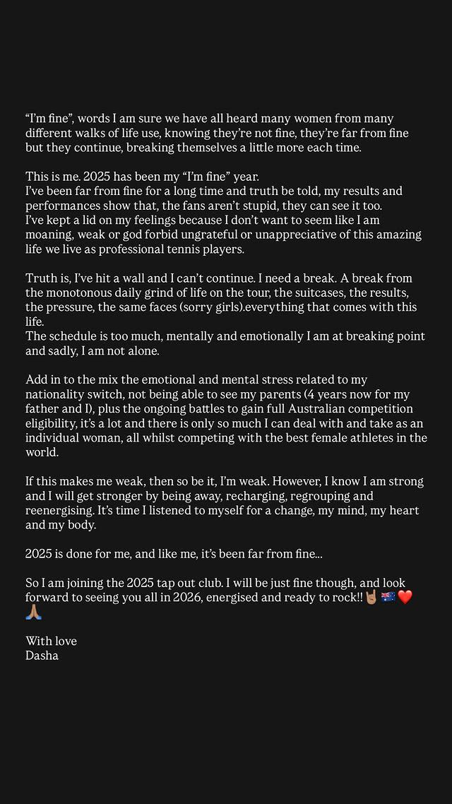 De Australische toptennisster Daria Kasatkina moet per direct een punt achter haar seizoen zetten. De 28-jarige tennisster deelde een openhartig verhaal over haar zware seizoen en hoe ze probeerde een andere indruk te wekken dan de realiteit.