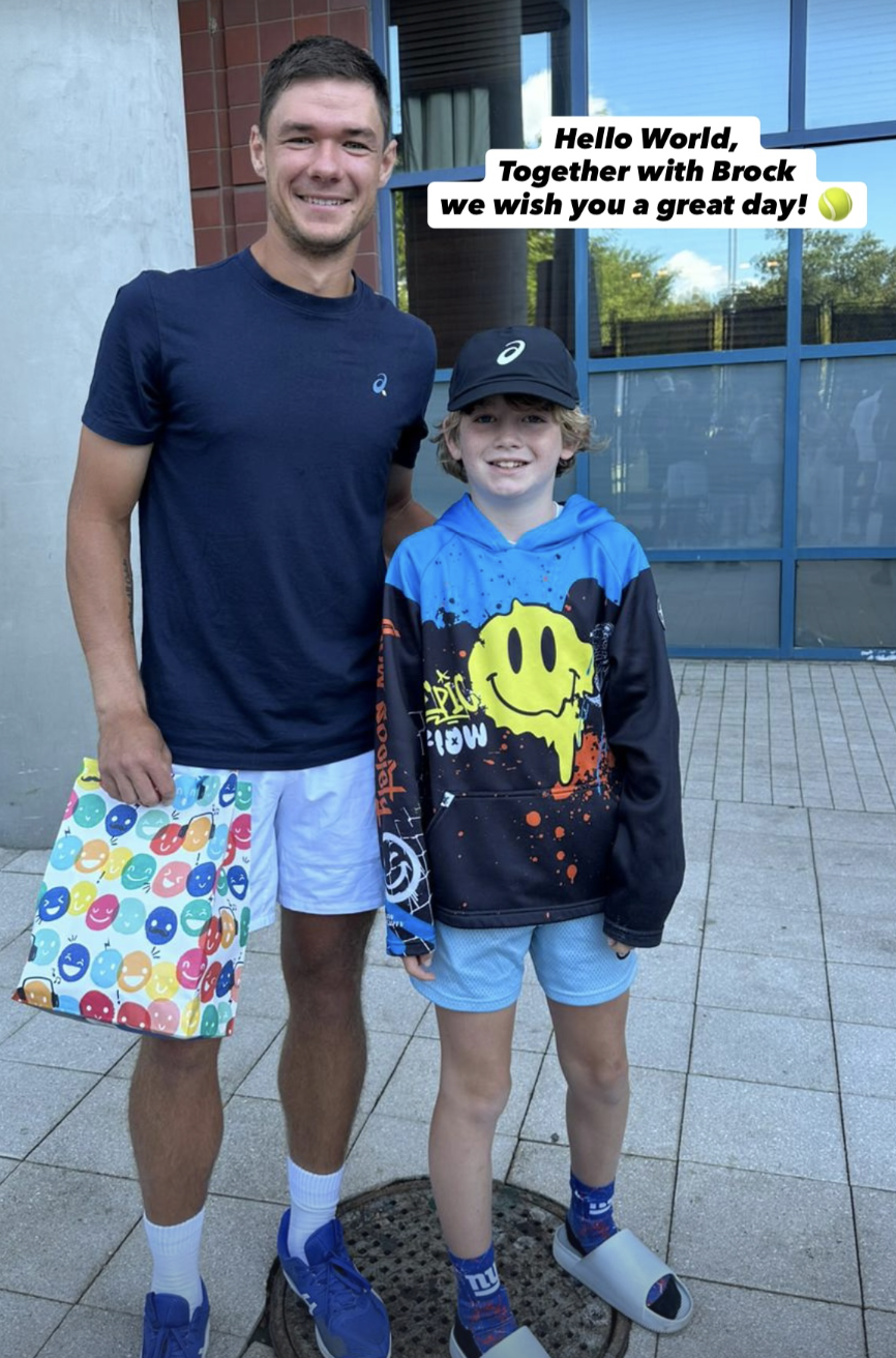 'Vandaag na de warming-up, had ik een leuke ontmoeting', schrijft de Pool bij de beelden. Ook gingen de twee samen op de foto. 'Hallo wereld, samen met Brock (naam van de jongen, red.) wens ik jullie een fijne dag', schrijft de tennisser bij de foto van hun ontmoeting.