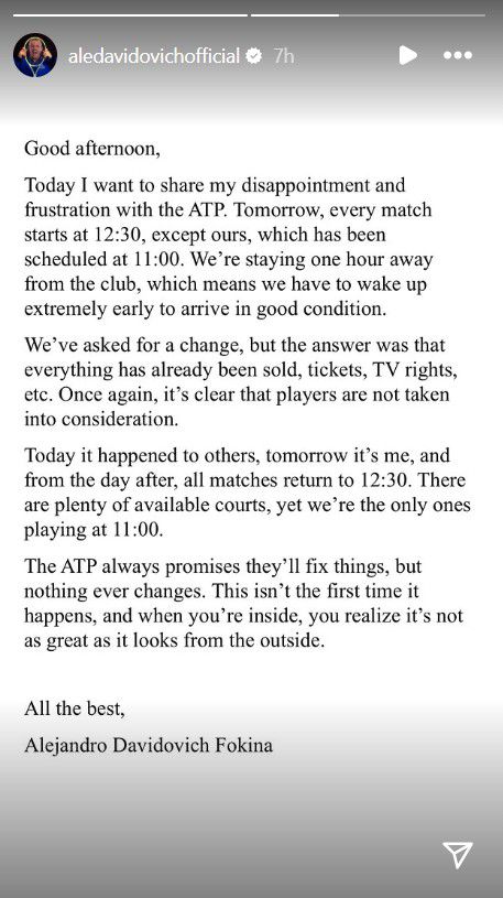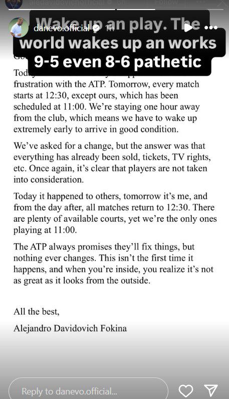 'Vandaag wil ik mijn teleurstelling en frustratie richting de ATP delen', begint Davidovich Fokina aan zijn relaas over de ATP. 'Vrijdag begint elke wedstrijd om 12:30 uur, behalve die van ons. Wij moeten om 11:00 uur starten. We verblijven een uur van de baan en dat betekent dat we extreem vroeg op moeten staan om in goede conditie aan te komen. We hebben om een aanpassing gevraagd, maar het antwoord was dat alles al verkocht was. Tickets, TV-rechten etc,. Nogmaals wordt het duidelijk dat er niet naar spelers geluisterd wordt.'