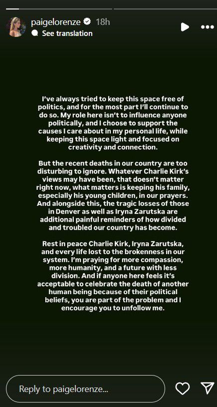 "Rust in vrede Charlie Kirk, Iryna Zarutska en alle doden die zijn gevallen door ons gebroken systeem. Ik bid voor meer compassie, meer menselijkheid en een toekomst met meer saamhorigheid. Ik wil alle mensen zeggen die de dood van een ander toejuichen vanwege diens politieke uitingen laten weten, jij bent onderdeel van het probleem en ik wil je vragen om mij te ontvolgen", is Lorenze duidelijk.