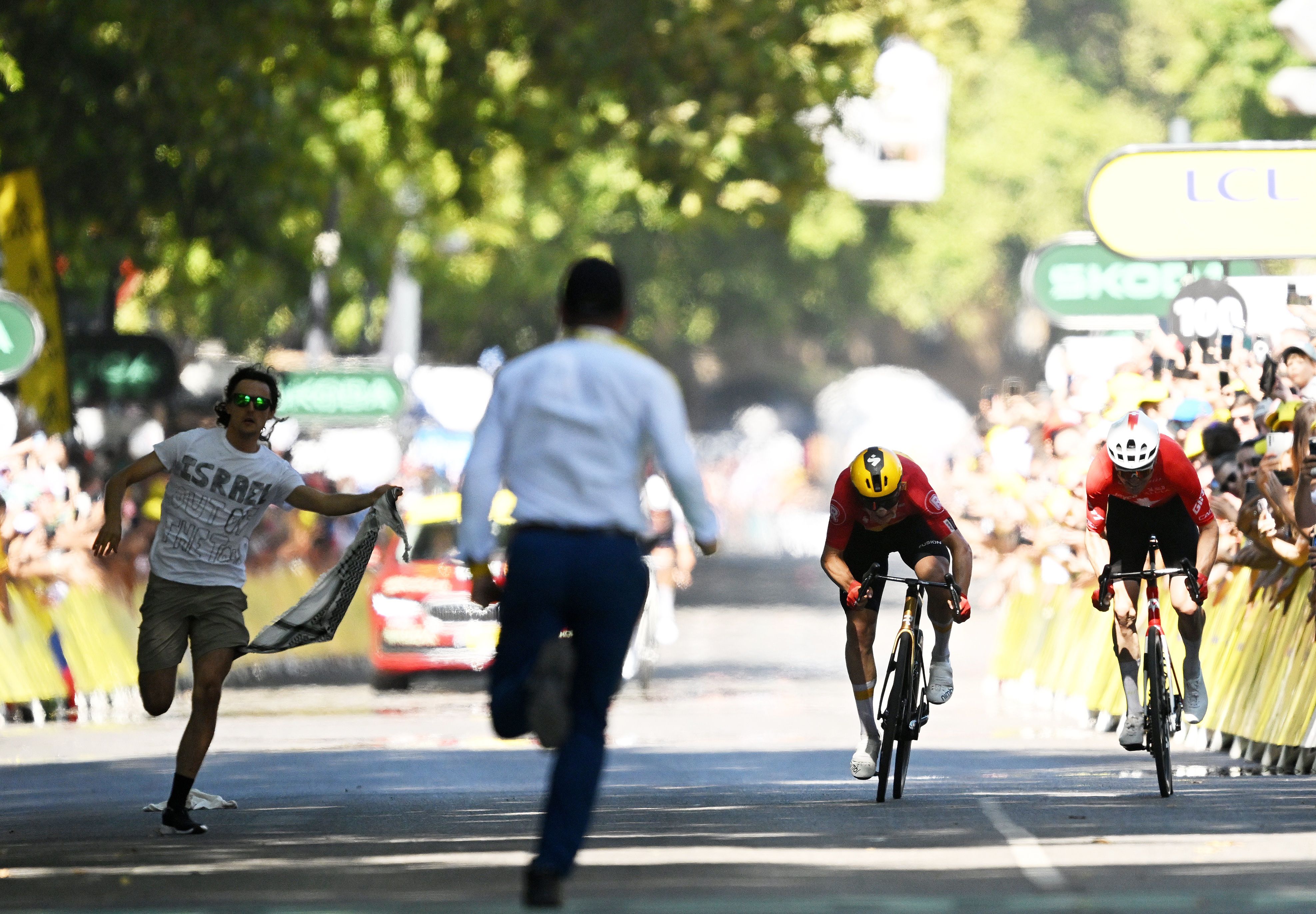 Een demonstrant rent de finishstraat op van de elfde etappe van de Tour de France en wordt keihard getackled. ©Getty Images