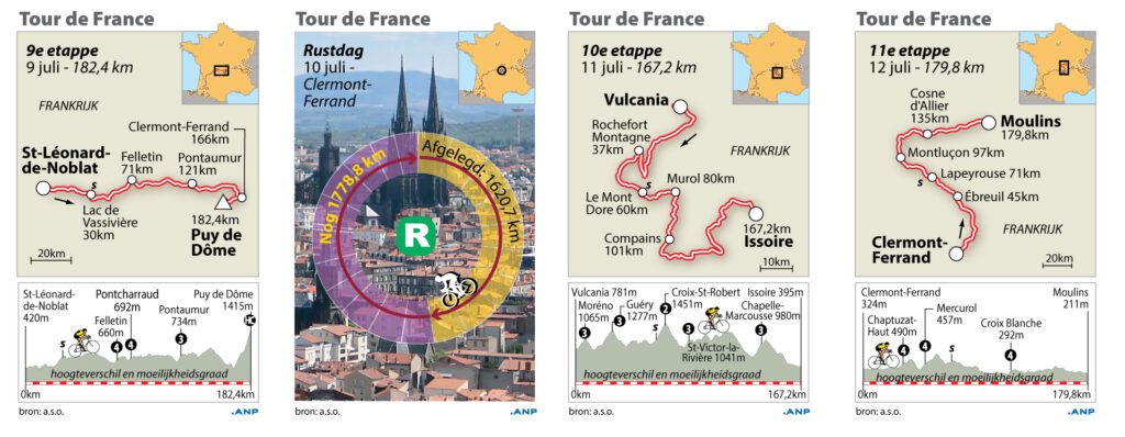 Met ook nog de Col de la Croix Saint-Robert (6 kilometer à 6,3 procent), Côte de Saint-Victor la Rivière (3 kilometer à 5,9 procent) en later de Côte de la Chapelle-Marcousse (6,5 kilometer à 5,6 procent) is het vandaag geen moment vlak. De finish ligt in een dalende lijn in Issoire. Wie mag zijn armen na 167,2 kilometer in de lucht steken?