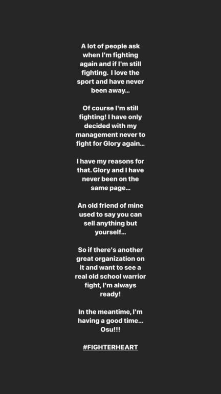"Veel mensen vragen me wanneer ik weer ga vechten en of ik sowieso nog wel een gevecht ga hebben. Ik hou van de sport en ben nooit gestopt. Natuurlijk komt er een gevecht! Maar mijn management en ik hebben wel besloten, dat ik nooit meer vecht bij Glory."
