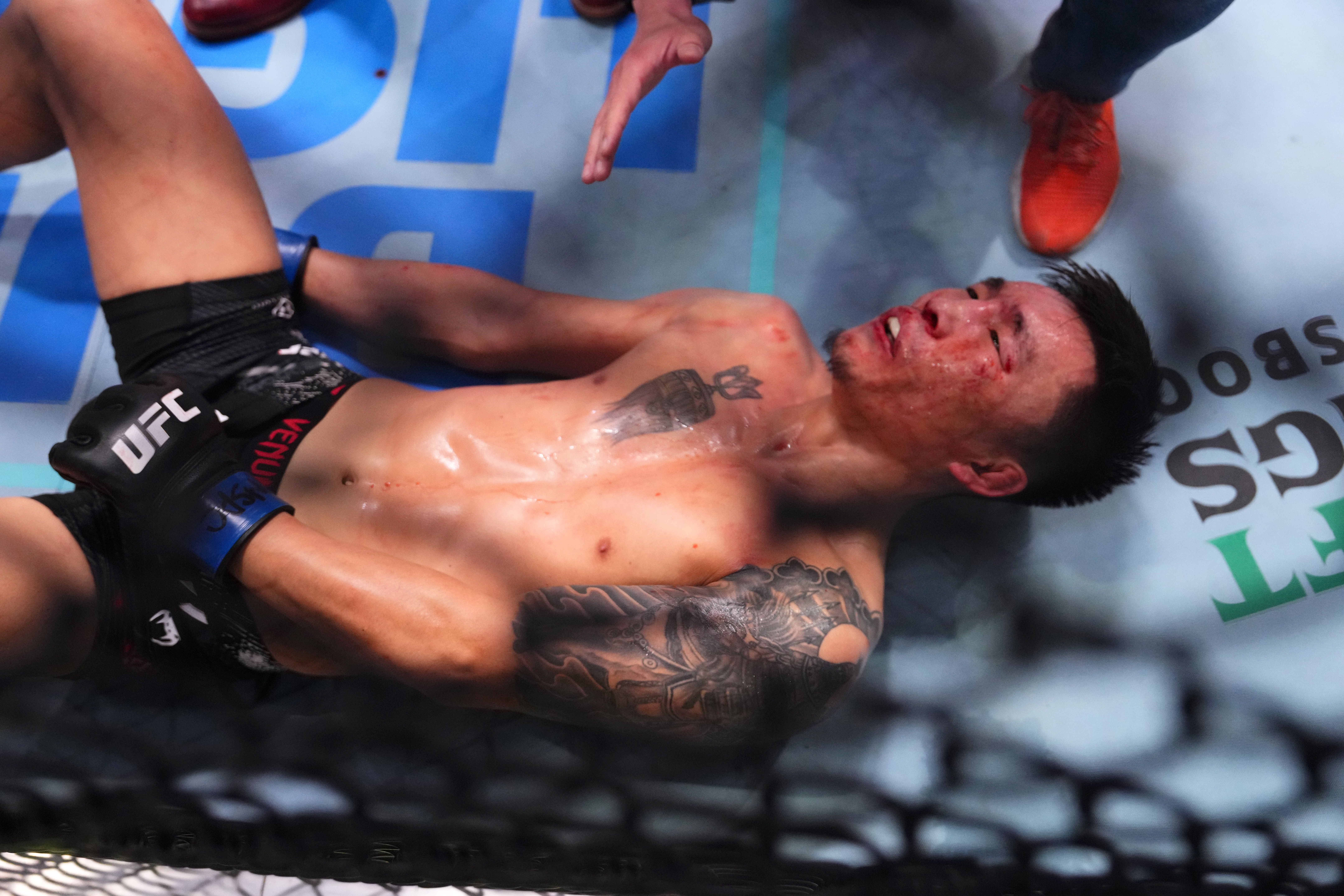 Aoriqileng kan niet verder nadat hij voor de tweede keer in korte tijd in z'n ballen is getrapt door tegenstander Daniel Marcos tijdens UFC Vegas 86. ©Getty Images