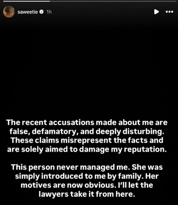 Ook spreekt Saweetie tegen dat Mayy ooit haar manager is geweest. "Deze vrouw is simpelweg aan mij voorgesteld door mijn familie. De achterliggende gedachte achter haar uitspraken is nu duidelijk. Ik laat de advocaten het vanaf hier overpakken." Met de laatste zin laat Saweetie indirect weten dat ze het er niet bij laat zitten en een rechtszaak aan zal spannen tegen Mayy.