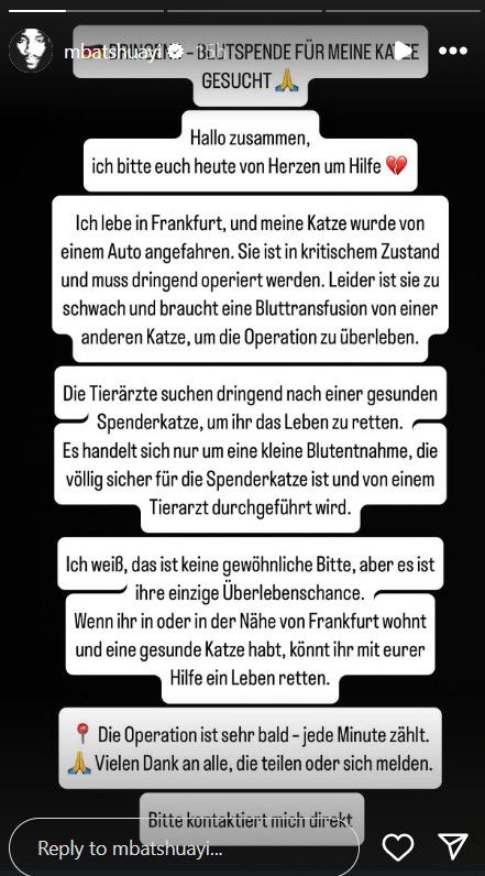 Batshuayi vraagt nu via Instagram of er een donorkat is die de zijne kan helpen. Volgens de spits is de transfusie voor de donorkat volledig veilig en wordt de ingreep uitgevoerd door professionele dierenartsen. Batshuayi laat weten dat elke seconden telt, aangezien de operatie van zijn kat al is ingepland. De Belg beseft dat zijn oproep enigszins ongebruikelijk is, maar het is voor zijn kat de enige reden om in het leven.