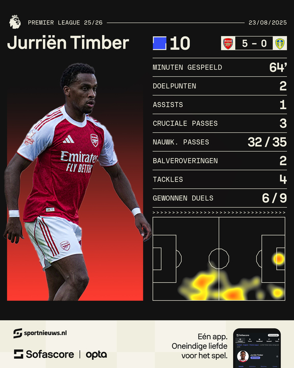 Mede door de goals van Timber staat Arsenal aan kop in de Premier League met 6 punten uit twee wedstrijden. Stadgenoot Tottenham Hotspur heeft evenveel punten, maar een minder doelsaldo. Spurs won zaterdagmiddag knap met 2-0 op bezoek bij Manchester City.