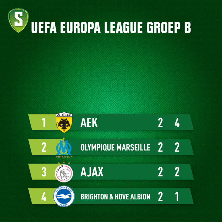 Ajax staat momenteel op een derde plek in de poule, maar alles zit nog erg dicht bij elkaar. AEK Athene staat momenteel bovenaan met 4 punten en speelt donderdagavond tegen Marseille. Brighton staat onderaan met maar 1 punt die zij vorige speelronde behaalde tegen Marseille.