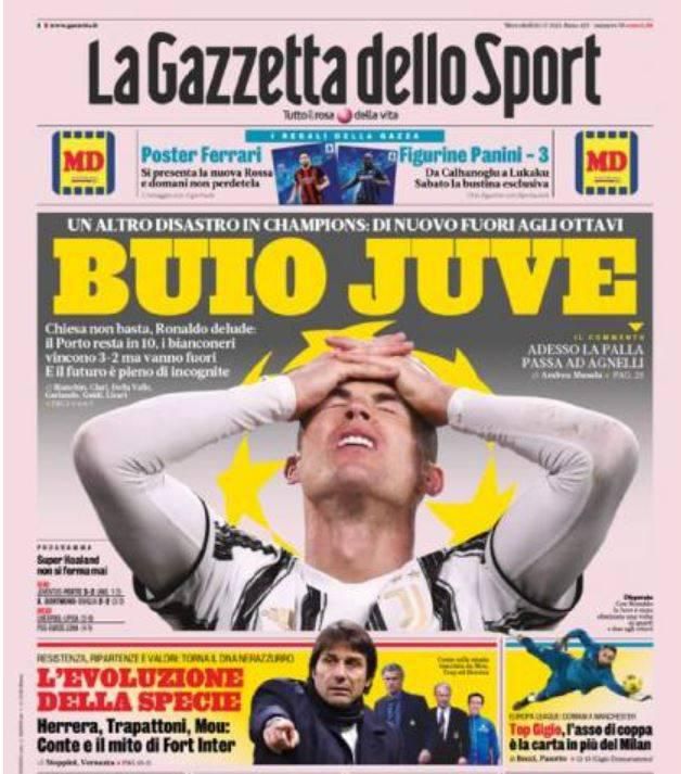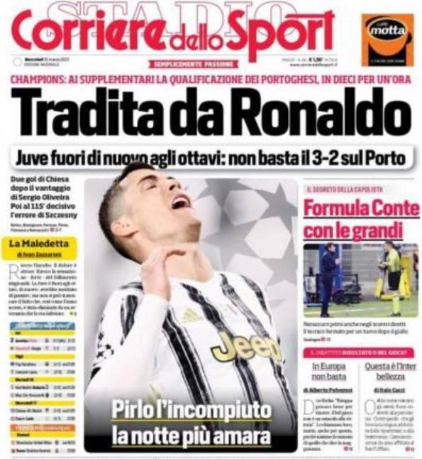 La Corriere dello Sport is al net zo kritisch. ‘Tradita da Ronaldo’ staat er op de cover, wat zich laat vertalen als ‘Verraden door Ronaldo’. Tuttosport stelt zelfs dat Juventus ‘vervloekt’ is. Namens Juve zelf was trainer Andrea Pirlo eveneens helder. ,,We hebben, als je kijkt naar beide wedstrijden, 4 fouten gemaakt. Dat zijn er in de achtste finales van de Champions League teveel. Dan word je afgestraft.”