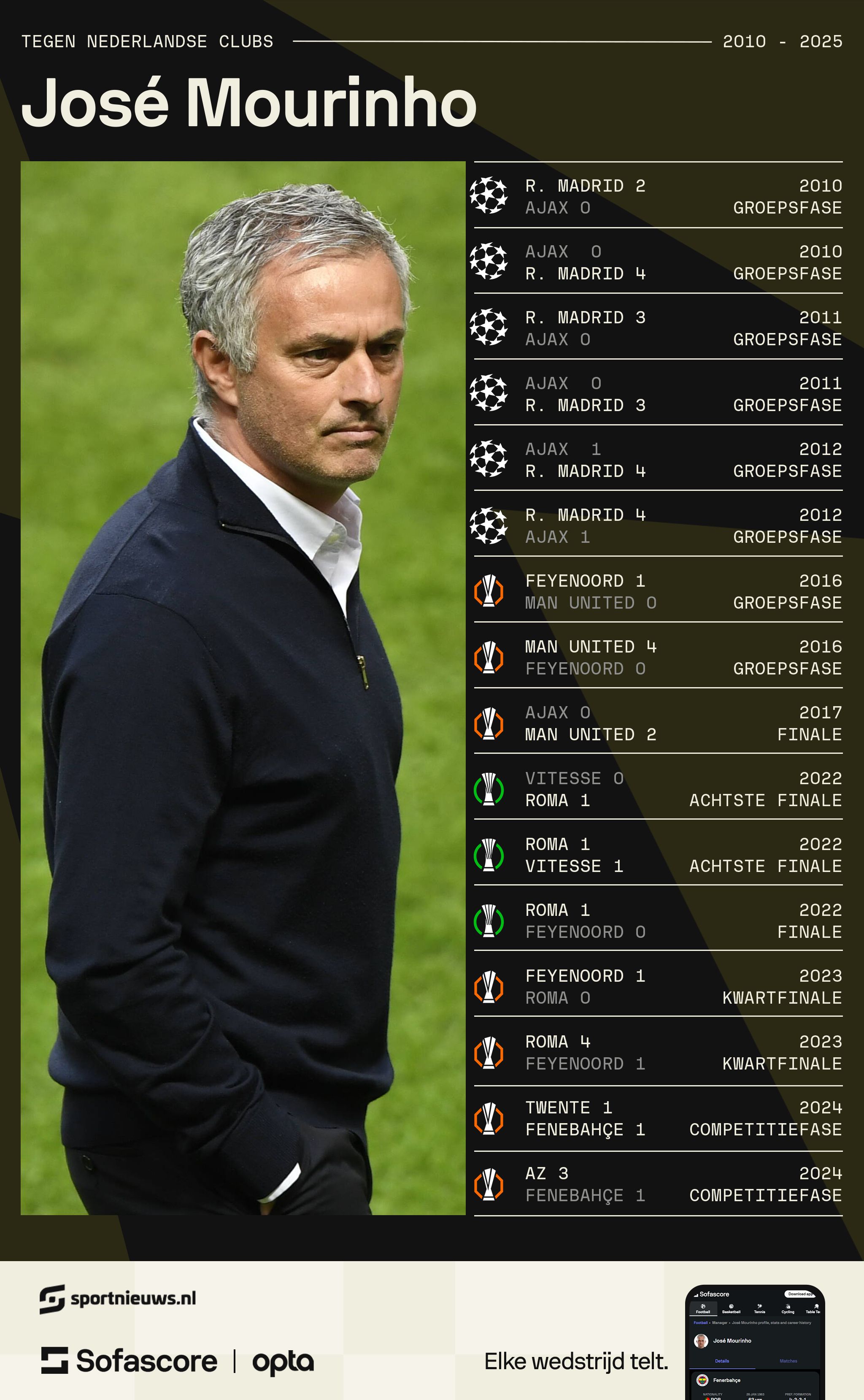 Opnieuw staat José Mourinho als tegenstander tegenover een Nederlandse club in Europa. Deze zomer is het Feyenoord dat in de derde voorronde van de Champions League aan Fenerbahçe en de Portugese topcoach is gekoppeld. Voor de ploeg van Robin van Persie wacht een zware opgave: de historie leert dat Nederlandse teams het steevast lastig hebben tegen ploegen van Mourinho.