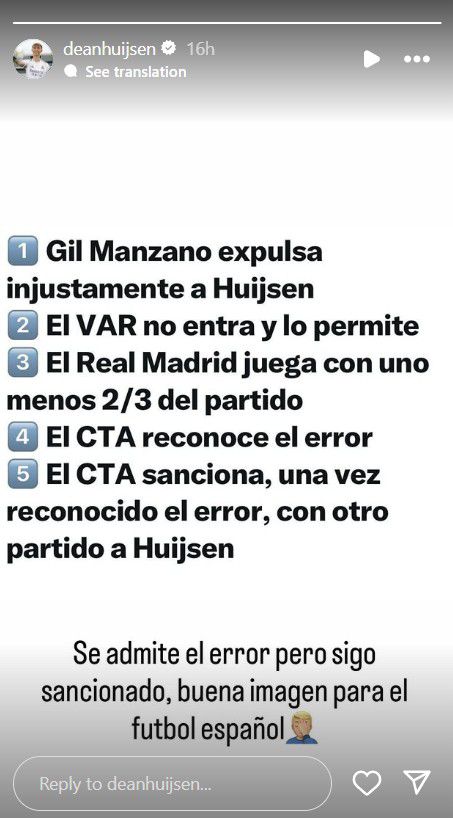Op zijn Instagram haalt Huijsen uit naar de Spaanse voetbalbond. "1. Gil Manzano stuurt Huijsen onterecht van het veld. 2. VAR grijpt niet in en keurt de beslissing goed. 3. Real Madrid speelt 2/3 van de wedstrijd met tien man. 4. De scheidsrechterscommissie erkent de fout. 5. Nadat de fout is erkend, schorst de commissie Huijsen voor één wedstrijd. De fout is erkend, maar ik ben alsnog geschorst. Lekker imago voor het Spaanse voetbal..."