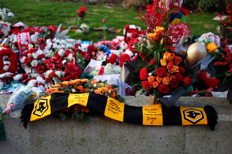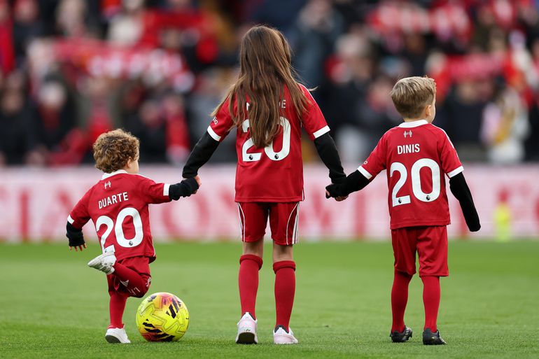 Jota kwam afgelopen zomer samen met zijn broer André Silva om het leven bij een tragisch auto-ongeluk in het noorden van Spanje. Jota was op de weg terug naar Engeland en werd daarbij vergezeld door zijn broer. Dinis en Duarte betraden samen met Liverpool-aanvaller Van Dijk onder luid applaus het veld terwijl het Liverpool-clublied You'll Never Walk Alone klonk.