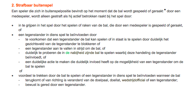We hebben even in de reglementen gedoken van de KNVB over 'strafbaar buitenspel'. Daarin stond onder andere deze uitspraak: "Een speler die zich in buitenspelpositie bevindt... wordt alleen gestraft als hij betrokken raakt bij het spel door: een tegenstander in diens spel te beïnvloeden door te voorkomen dat een tegenstander de bal kan spelen of in staat is te spelen door duidelijk het gezichtsveld van de tegenstander te blokkeren."