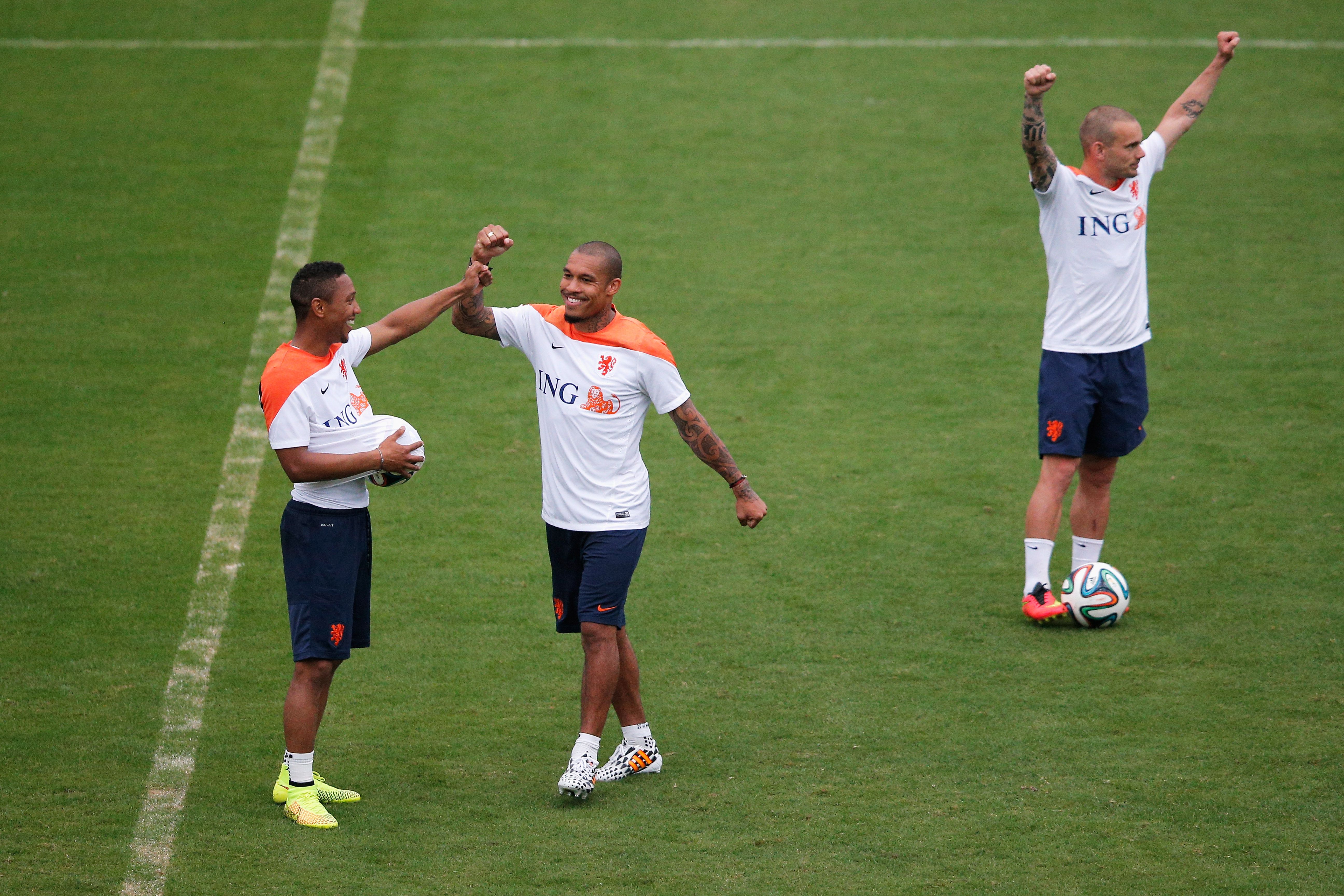 Jonathan de Guzmán met Wesley Sneijder en Nigel de Jong op het WK 2014 ©Getty Images