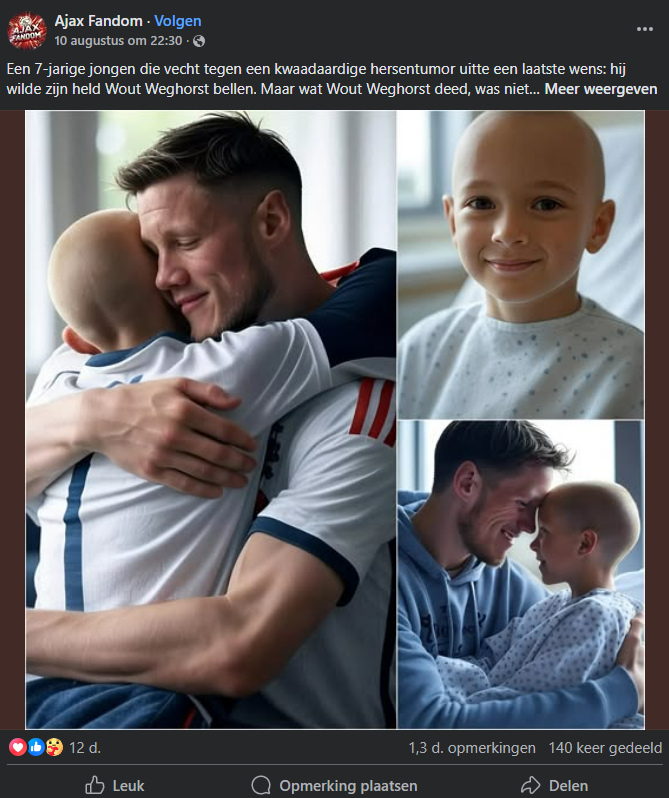 Het begon allemaal met een reeks aan foto's van de Facebookpagina Ajax-fandom. Zij deelden dit weekend vol lof foto's van Weghorst die een zevenjarig doodziek jongetje zou bezoeken. Dat levert uiteraard alleen maar lovende reacties op. Na een paar dagen stond de teller op meer dan 12 duizend likes en ruim duizend reacties. Ook werden de foto's zo'n 140 keer gedeeld.