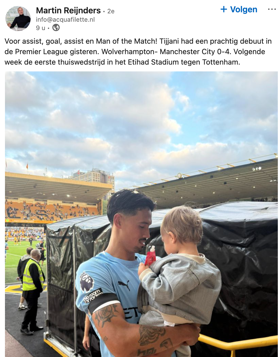 Vader Martin was zo trots als een pauw op zijn zoon. Dit liet hij blijken op zijn LinkedIn. "Voor assist, goal, assist en Man of the Match! Tijjani had een prachtig debuut in de Premier League gisteren", zo schreef hij bij een foto waarop de voetballer met zijn zoontje Xavién Lio Ti staat.