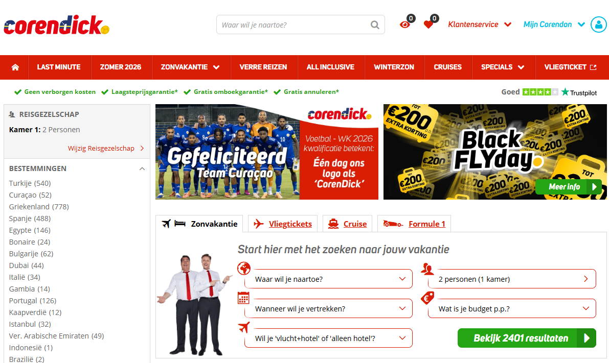 De website van Corendon staat volledig in het teken van de WK-plaatsing van Curaçao.