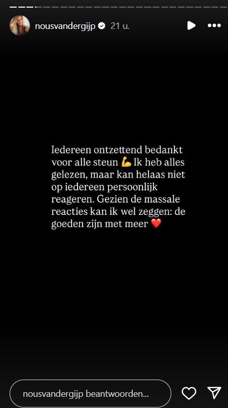 Van der Gijp liet zondag via haar Instagram weten dat ze een hoop mooie steunberichten heeft gekregen na haar heftige verhaal over de bedreigingen. "Iedereen ontzettend bedankt voor alle steun. Ik heb alles gelezen, maar ik kan helaas niet op iedereen reageren. Gezien de massale reacties kan ik wel zeggen: de goede zijn met meer", laat Van der Gijp weten met een hartje bij de tekst gevoegd.
