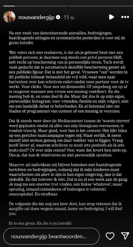 Andere mensen gingen echter een stuk verder. Veel te ver, aldus Van der Gijp via story's. "Na een week van demoniserende aanvallen, bedreigingen, haatdragende uitingen en systematische pesterijen is voor mij de grens bereikt. Het lijkt bijna op een gerichte haatcampagne tegen mij. Zodanig dat ik mijn kinderen moet waarschuwen om alert te zijn in hun eigen omgeving, dan is dat ziekelijk", zo vertelt Van der Gijp op haar story's over de afgelopen week.