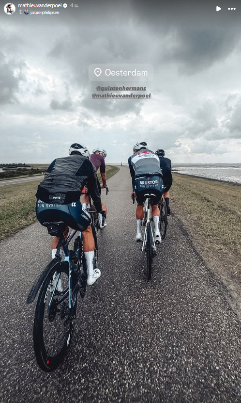De toprenner was zondag niet van de partij, maar zit inmiddels wel weer op de fiets, zo blijkt uit een foto die hij op zijn Instagram deelde. Samen met ploeggenoten Jasper Philipsen en Quinten Hermans maakt Van der Poel weer wat meters op zijn racefiets.