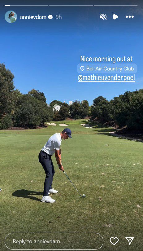 Op haar Instagram plaats Van Dam een story met de tekst 'Nice morning out', waarbij ze Van der Poel en de Bel-Air Country club tagt. De wielrenner is op de foto te zien terwijl hij wil afslaan voor de volgende hole. Van Dam maakt na de story niet bekend wie uiteindelijk de beste van de twee was. Van der Poel deelt beelden van een afslag van zijn metgezel met de afbeelding van een vuurtje erbij, ze ik kortom lekker op dreef.